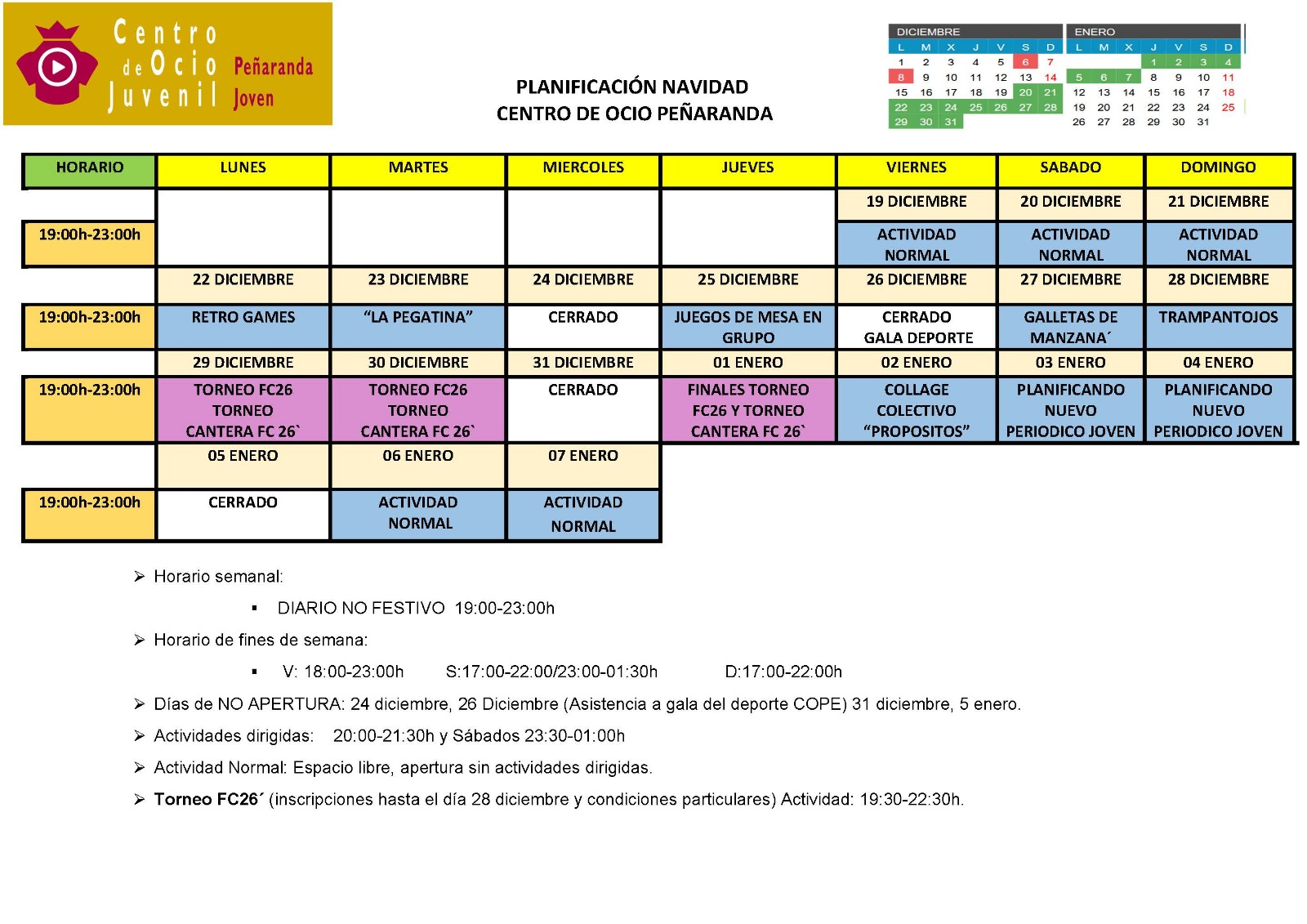 Durante el periodo navideño, el Centro de Ocio Juvenil mantendrá su horario habitual de apertura (19:00 a 23:00 horas en días no festivos), con ampliación los fines de semana, salvo en los días de cierre previstos: 24 de diciembre, 26 de diciembre, 31 de diciembre y 5 de enero.