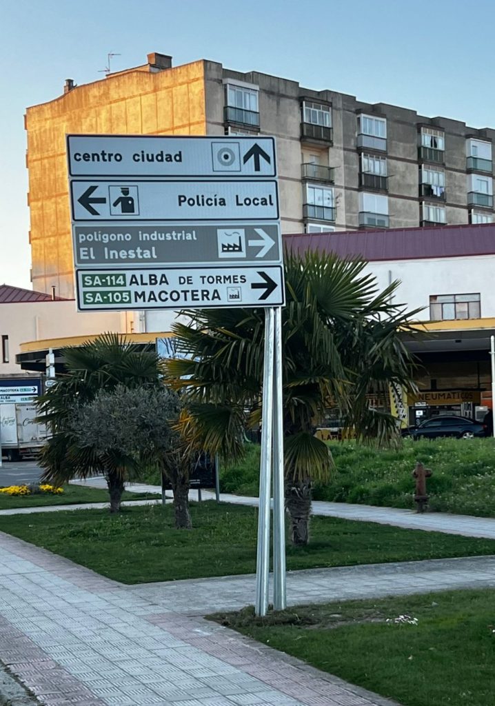 La nueva señalización incorpora indicaciones más claras hacia el polígono industrial “El Inestal”, así como hacia las vías SA-114 (dirección Alba de Tormes) y SA-105 (dirección Macotera), permitiendo una mejor distribución de los flujos de tráfico en este punto estratégico del municipio.